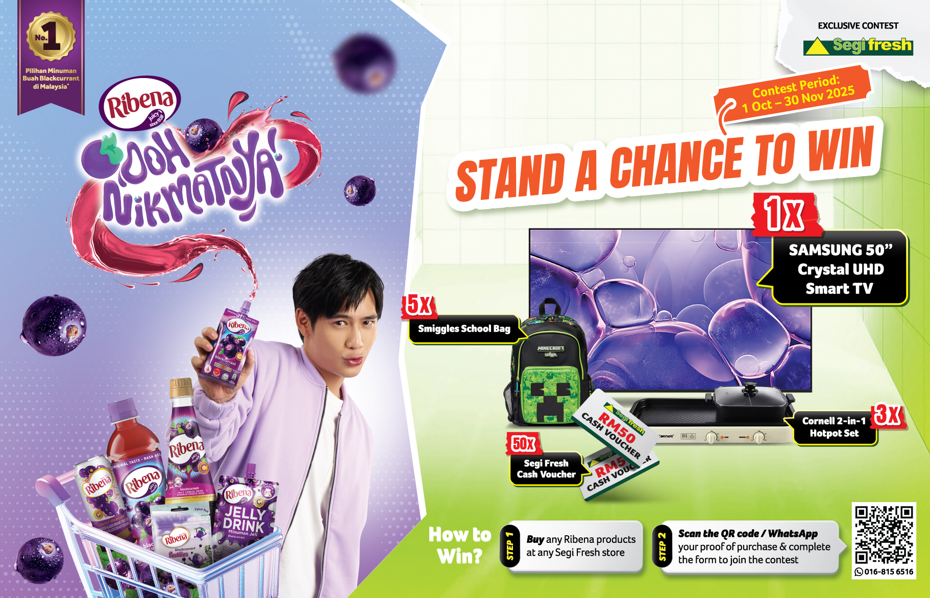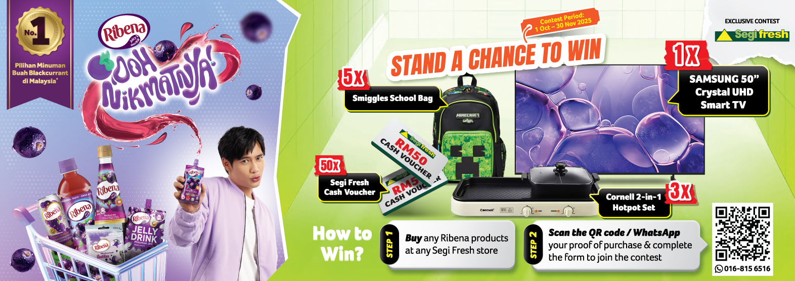 - Untuk menyertai Peraduan ini, peserta perlu membeli sebarang produk Ribena dari Segi Fresh [“Bukti Pembelian”]. Setiap resit dengan pembelian produk Ribena akan diberikan satu (1) penyertaan.